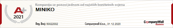 | Bonitetna kuća CompanyWall ocjenu A+ dodjeljuje firmi koja napreduje u poslovnim uspjesima, firmi koja je sposobna da podmiri svoje obaveze i uspješno izbjegne poslovne rizike. Saradnja s firmom kojoj je dodjeljena ocjena A+ usmjerena je na uspješan poslovni razvoj. |
